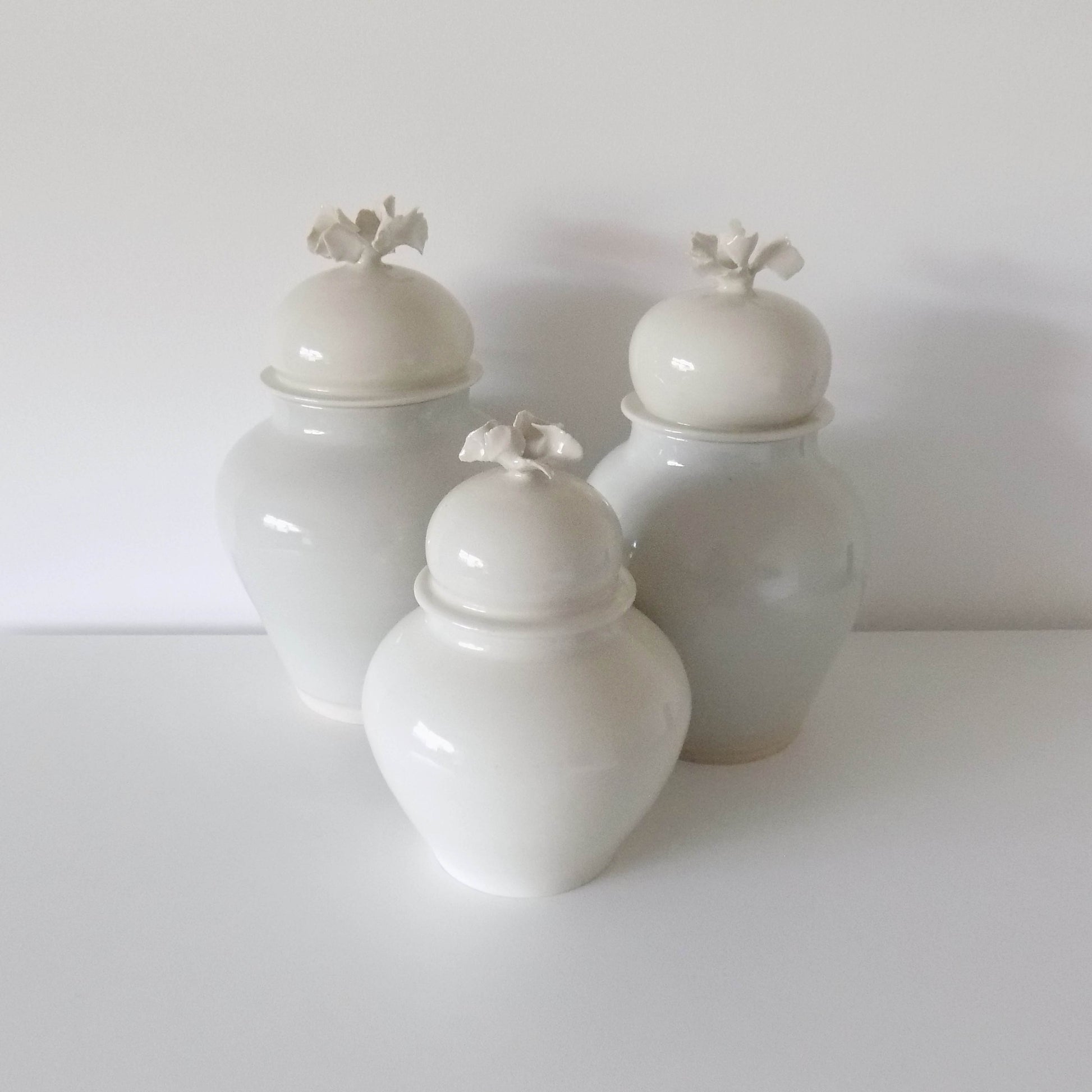 A delicate, simple, and one-of-a-kind ginger jar. Made with porcelain and a clear glaze. Trimmed bottom with a gracefully intricate lid.