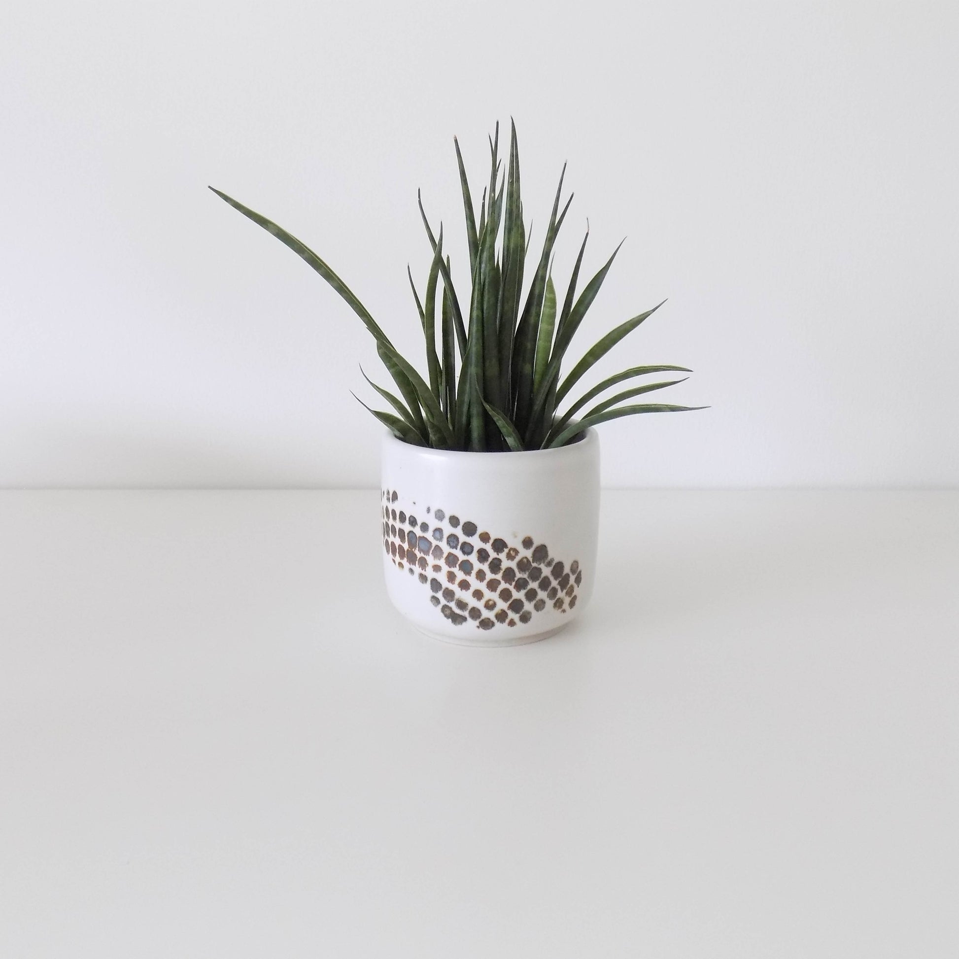 Glazed with a satin white canvas with a spotted black and iron oxide motif atop a smooth, light-grey clay.
